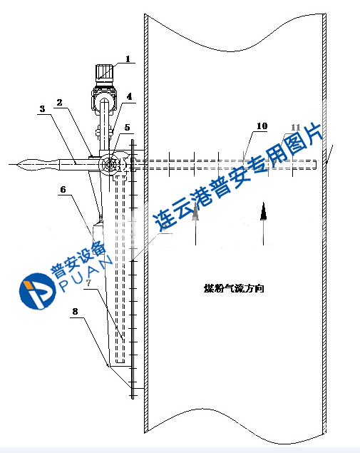 12、 外殼體—安裝在煤粉管道上,不取樣時取樣管隱藏在其中。